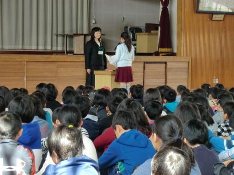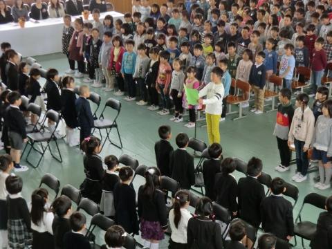 代表の6年児童から贈る言葉がありました。先生たちから学んだ一つ一つのことを大切にし、新しいクラス、新しい学年でがんばるので安心してほしいと言葉をかけていました。