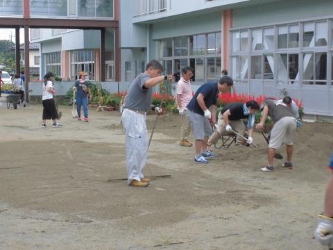 今回は校舎内の清掃や体育館備品の整理、運動会備品の点検・補充、中庭の窪み埋め、側溝清掃などを行いました。