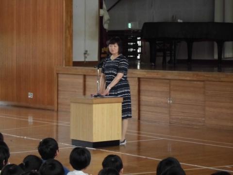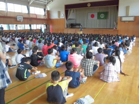 8/28(月)昼休みに夏休み明け集会を実施しました。校長と児童指導主任よりお話がありました。