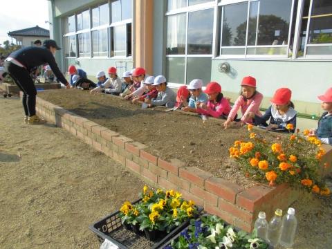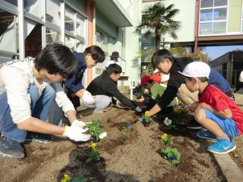 グリーンタイムでは、花壇にパンジー苗とチューリップ球根の植え付けを行いました。日々寒くなる季節ですが、つかの間の暖かな日差しの中で活動に取り組むことができました。