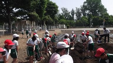 学校農園ではさつまいも作りが進められています。うねを作りマルチを張りました。写真は6年生の様子です。慣れない農作業だと思いますが、立派なうねが出来上がりました。さつまいもの苗も植え終わり、秋の収穫が楽しみです。