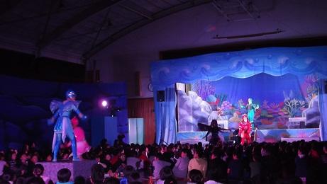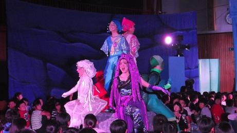 今日は2,3時間目に演劇鑑賞会を行いました。演劇のタイトルは「虹色サンゴ」です。いつもの体育館が幕や照明でミュージカルシアターのように様変わり。開演前から児童のわくわく感もいっぱいになりました。
