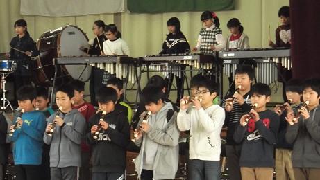 6年生からも、在校生に対してお礼の気持ちがこもった出し物がありました。リコーダー合奏とともに感謝の気持ちの呼びかけがあり、タブレットPCにはこれまでの思い出の写真が写されました。全員での器楽合奏は、6年生らしく心を一つに合わせた迫力ある演奏になりました。