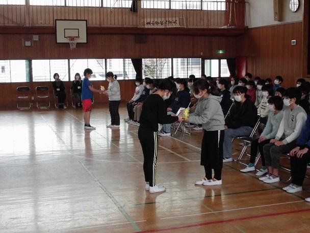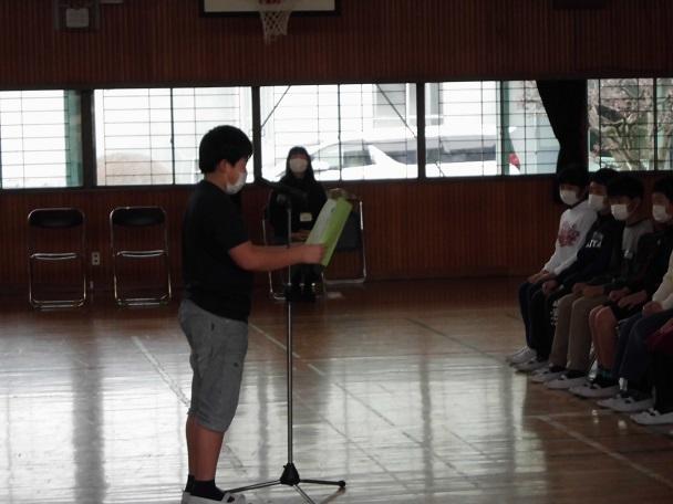 代表の児童が6年生へお礼の言葉を伝えたり、プレゼントを渡したり、1~5年生で「グッデーグッバイ」を歌ったりして感謝の気持ちを表現しました。6年生からも、「これからも東小学校を盛り上げてください。」と励ましの言葉をもらい、気持ちを新たにしました。