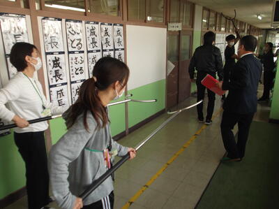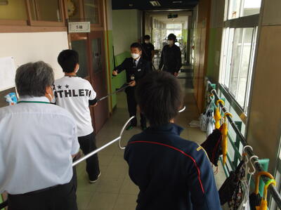 校内に不審者が侵入したことを想定し避難訓練を実施しました。児童は教室入口に机やいすでバリケードを作り、不審者の侵入を防ぐ方法を学びました。教師もさすまたを用い、不審者を子どもたちから遠ざける訓練を行いました。