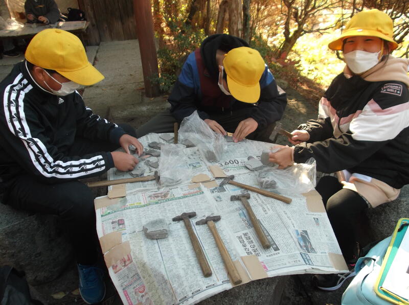 木の葉化石園では、展示された化石や鉱石を見たり、実際に石を割って木の葉の化石を見付けたりする体験をしました。