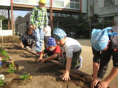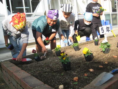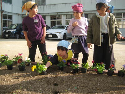 児童は、パンジーの苗をポットから取り出すとき、慎重に行っていました。また、チューリップの球根を植えるとき