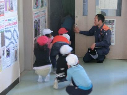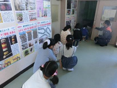 最後は、理科室での「煙体験」を行いました。腰を低くして、なるべく煙を吸い込まないように移動する体験です。