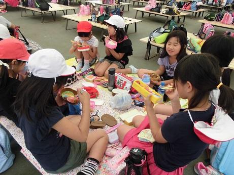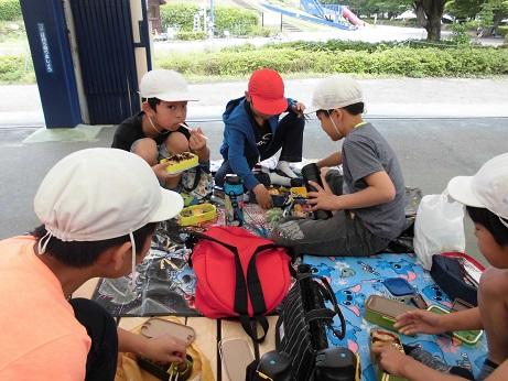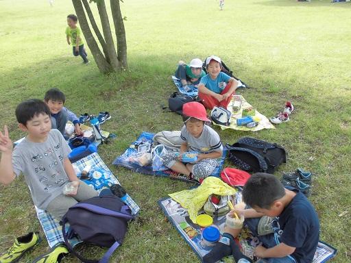 涼しい木陰にブルーシートを敷いて、みんなでお楽しみのお弁当です。