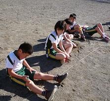 ずいぶん投げた玉が取れるようになりましたね。こっちは葉笛です。違う班が挑戦しています。