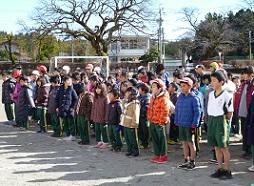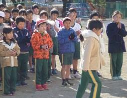 さて、いよいよ始まりますよ。こちら側が1年生、向こうに見えるのが6年生です。