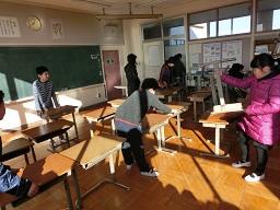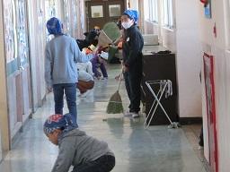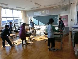今朝5年生の子どもたちが床に敷いてあったシートを片付けました。やるき満々、しっかりした5年生です。