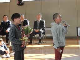 児童代表のあいさつをしているのは、6年生MR君です。すばらしいあいさつでした。