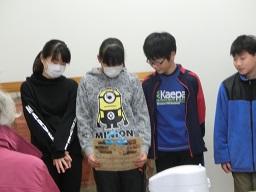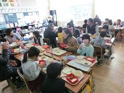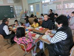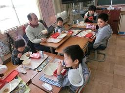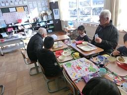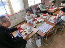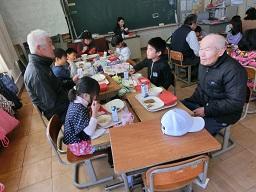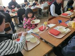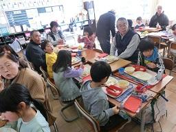 お年寄りの方を囲んでおいしい給食です。