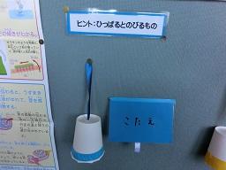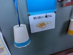 青い紙コップの中には「ひっぱると伸びるもの」が入っています。振って音を出して考えます。黄色の紙コップの中には「洋服についているもの」が入っています。