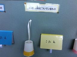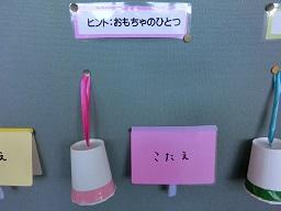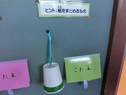 ピンクの紙コップの中には「おもちゃのひとつ」というヒントが出ています。そして緑の紙コップの中は「紙をまとめるもの」が入っているそうです。振ってよく耳で聞いてみてください。