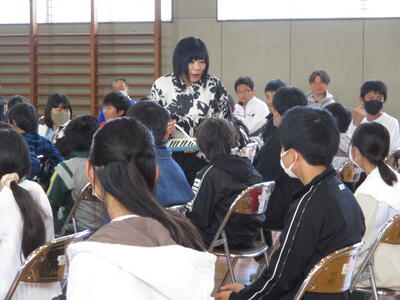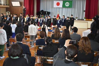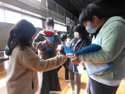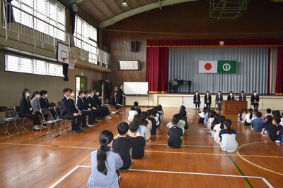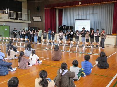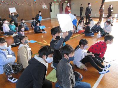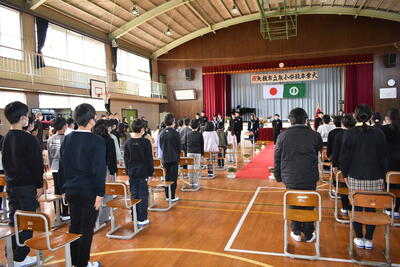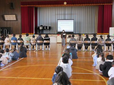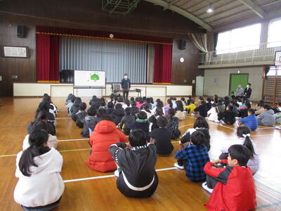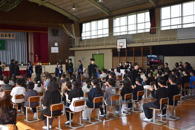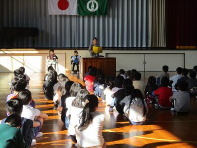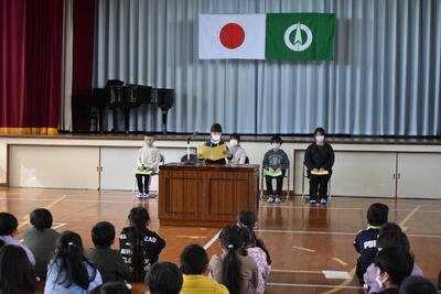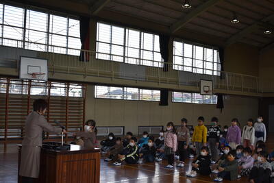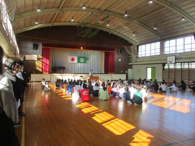 明日からの冬休みを前に、全校生が体育館で集会を行いました。校長から、お正月に込められた願いや、目標を立てることの大切さについて話しました。また、表彰の伝達も行いました。