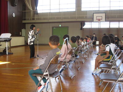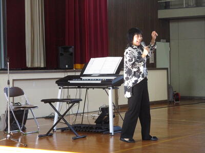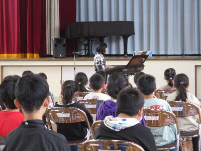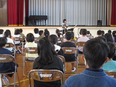 エレクトーン奏者の石下有美先生をお迎えし、体育館で音楽鑑賞会を行いました。ルパン3世のテーマ曲からスタート。子どもたちの心は、たちまちのうちにひきつけられました。アニメやディズニーの曲などが、エレクトーンから次々に生みだされ、時間は瞬く間に過ぎました。トークも絶妙で、楽しい・楽しい音楽鑑賞会となりました。