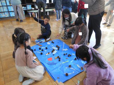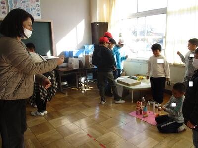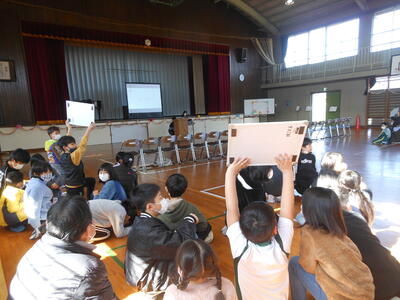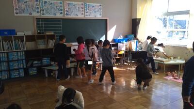 1、2年生が、生活科「冬の遊びを楽しもう」の学習で「昔の遊び」を体験しました。先生は、コミュニティ・スクールの方々で、かるた、だるまおとし、あやとり、けん玉、お手玉をやりました。コツを教えてもらいながら、昔の遊びを楽しみました。