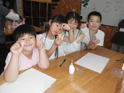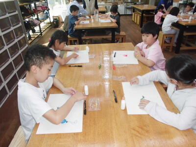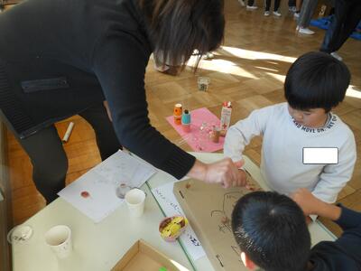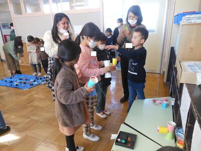 1年生が、生活科「あきをたのしもう」の学習で、「木のみのおもちゃまつり」を開きました。公園などで集めた木の実を使っておもちゃを作り、2年生をはじめ校内の友だちや先生たちを招待しました。どのおもちゃもよくできていて、また、1年生のお世話も上手で、たくさん楽しむことができました。