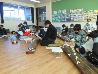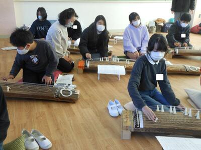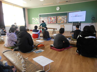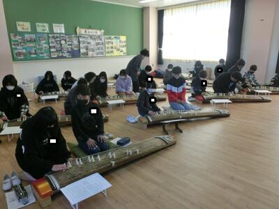 6年生が、音楽の時間に、琴の体験学習をしました。教頭先生の指導の下、宮永先生のお弟子さんにもお手伝いをお願いしました。二人で1面の琴を使い、その音色を楽しむことができました。「さくらさくら」の演奏ができたときは、とてもうれしそうでした。日本の古典楽器に親しむよい機会となりました。