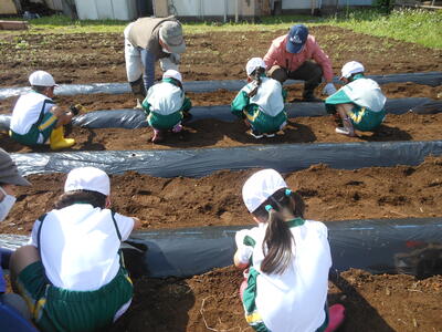 1年生と2年生が、生活科の学習で、サツマイモの苗植えをしました。「水の郷泉を守る会」の方々の支援を受けて、活動しました。秋にたくさん実ることを願って、丁寧に植え付けすることができました。