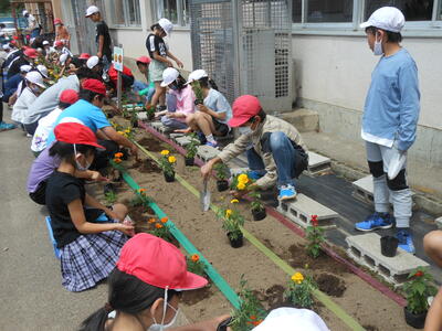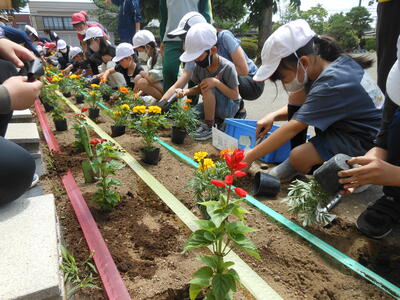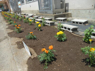 校舎前の花壇に、マリーゴールドとサルビアの苗を植えました。なかよし班ごとに、6年生のリードのもと、手早く作業が完了しました。花壇は、すっかり夏の装いとなりました。
