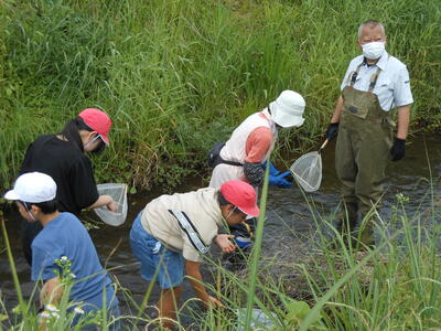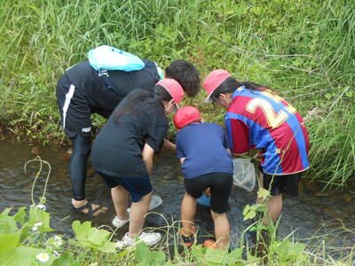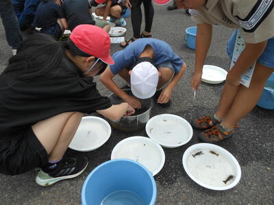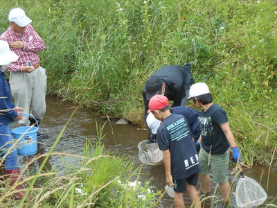 5年生が、学校近くの大江川で、「生き物調査」を行いました。これは、総合的な学習の活動で、川に住む生き物を指標にして川の状態を調べる学習です。市の環境課の方や水の郷泉を守る会、コミュニティスクールの方々にお手伝いいただいて調べ学習を進めました。川の状態を知って、今後、自分たちの生活と川の関係について考えていきます。
