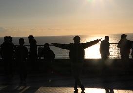 2日目の朝です。海の日の出が見える屋上に来ました。集合写真を撮りました。