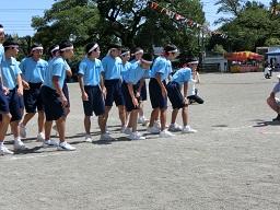 昼休みの後の最初の種目は応援合戦です。応援団の中学生が本部テント前に整列しました。