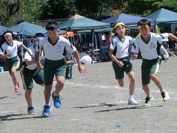 中学生のリレーの様子です。1年生がスタート。1週目が終わって次の1年生に渡します。