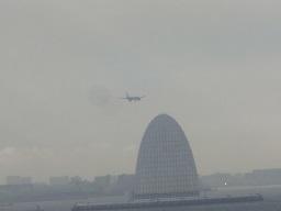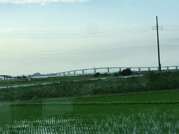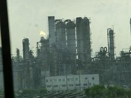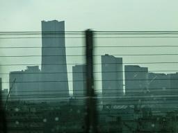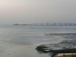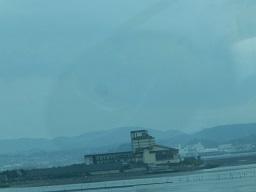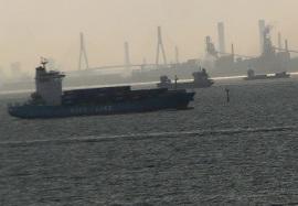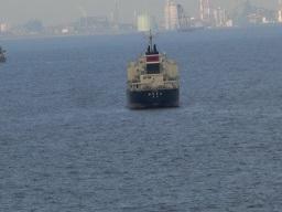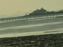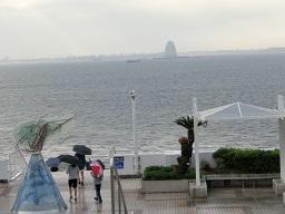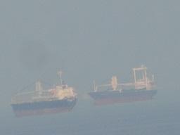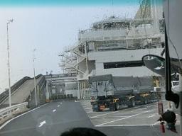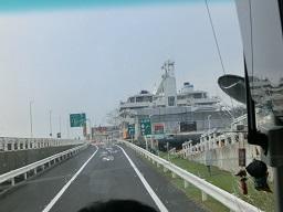 向こうには貨物船が見えます。並んでいるのは朝食会場前の廊下です。