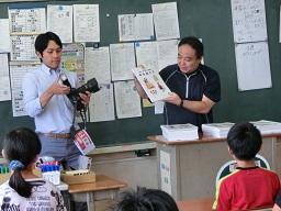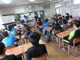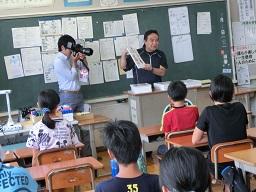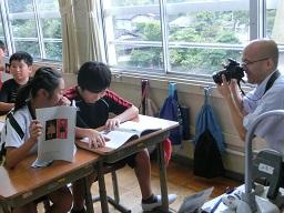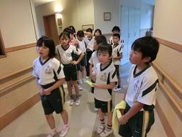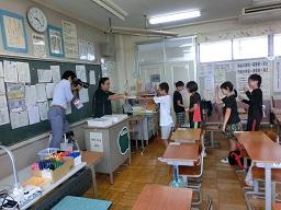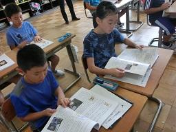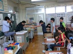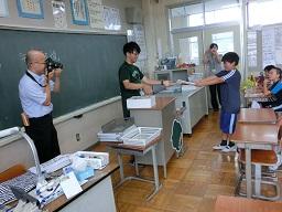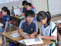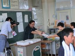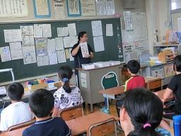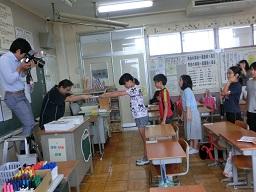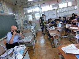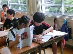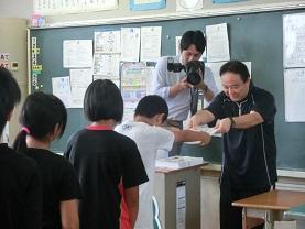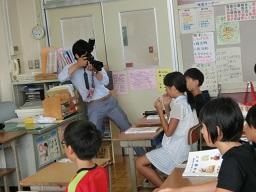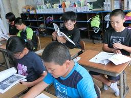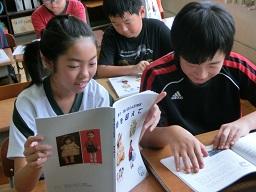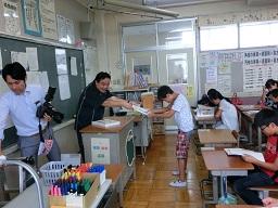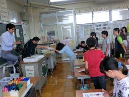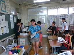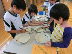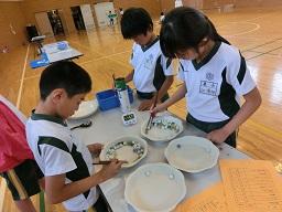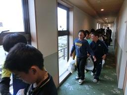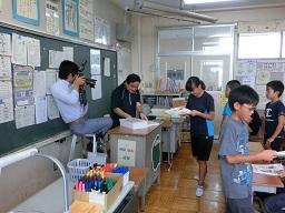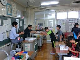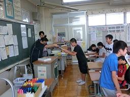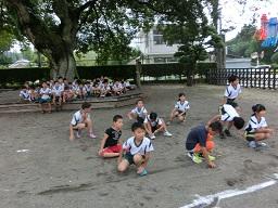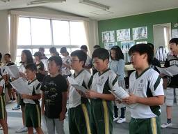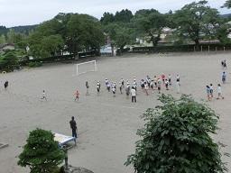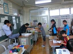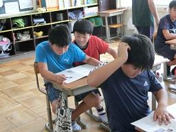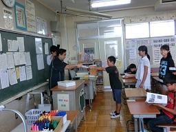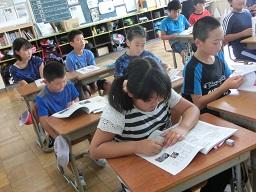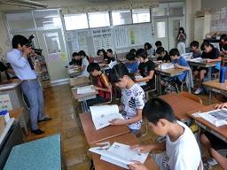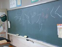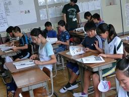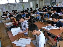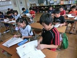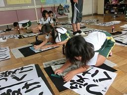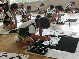 3年生が習字をしていると校庭では4年生から6年生がリレーの練習をしていました。