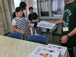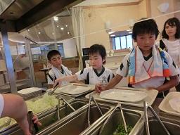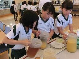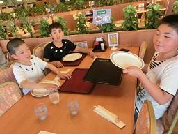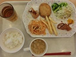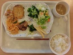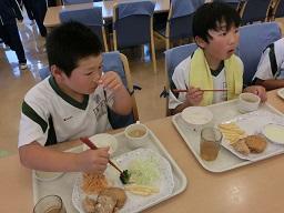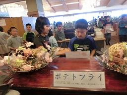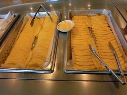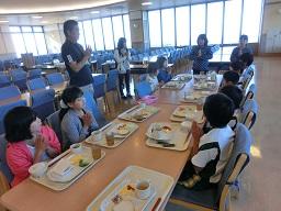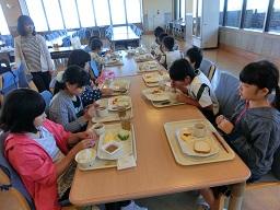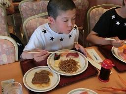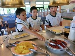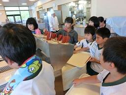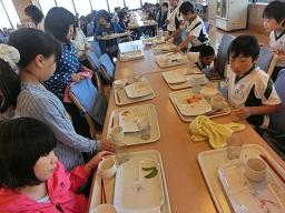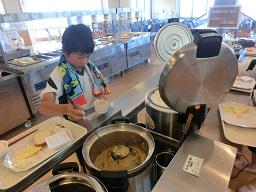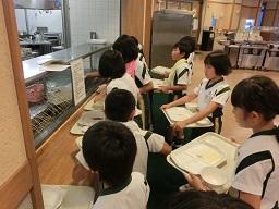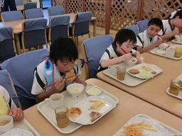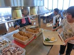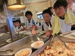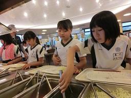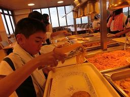 ここは「わかめ入り海藻うどん」です。子どもたちはポテトフライ、スバゲティを食べています。