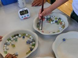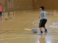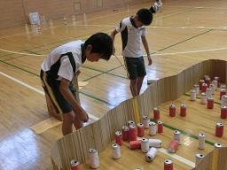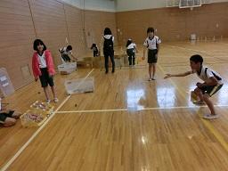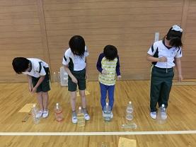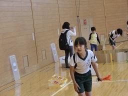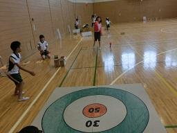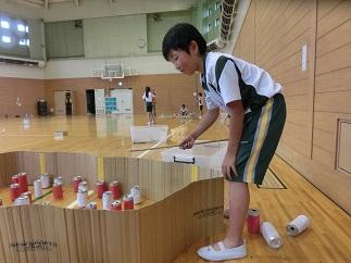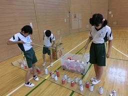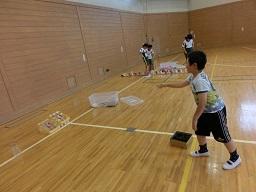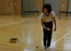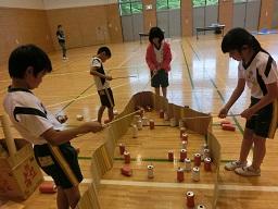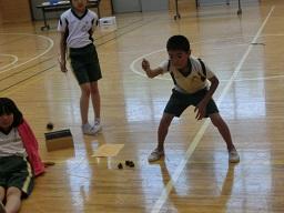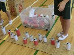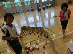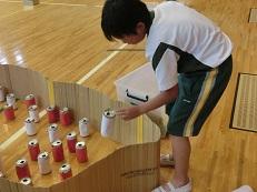 次は松ぼっくりを投げてペットボトルの容器に入れます。ちょうど輪投げと同じやり方です。