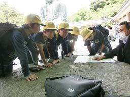 「とりあえず、大仏様の写真を撮っておくか。」 こっちは大きな石の上に地図を広げて、先生に相談しているようです。