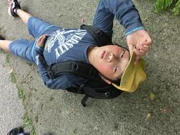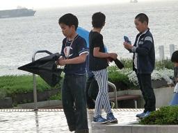 ベンチに横になる子が2名です。こっちは雨を両手で受けています。