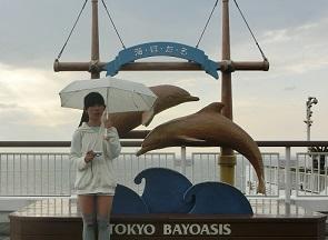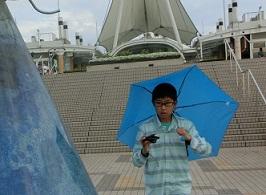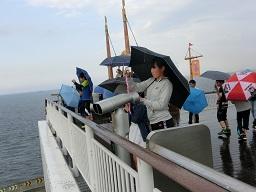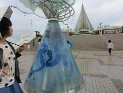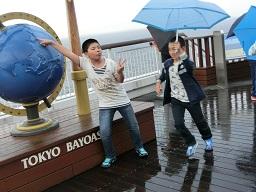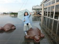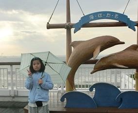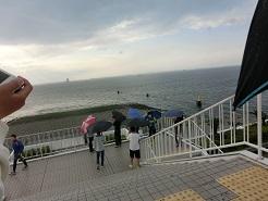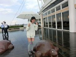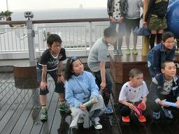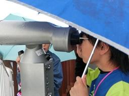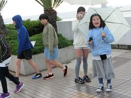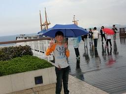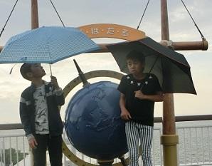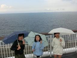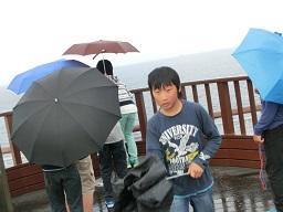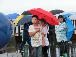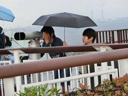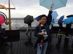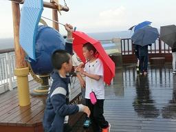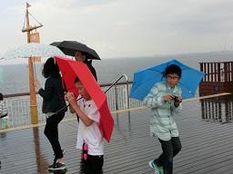 展望台から眺めを楽しんでいる女子です。その時、雨が降ってきました。しかたがないので、展望台の下の休憩所に避難しました。