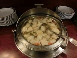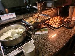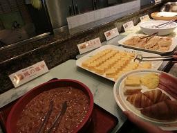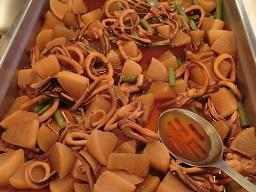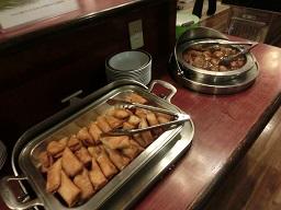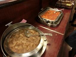 ジャガイモの煮込みとエビチリです。パンコーナーもあります。