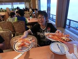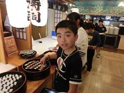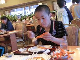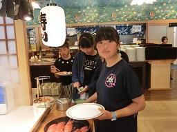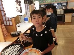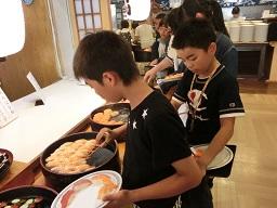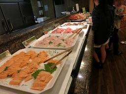 山のように積まれているのはタマネギの揚げ物「オニオンリング」です。刺身コーナーに来たOR君です。