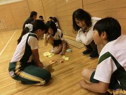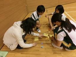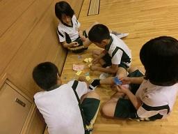 このチームの考えた出し物はちょっと複雑でした。チーム別の競争です。校長先生とじゃんけんをして勝つと点数のカードがもらえます。そのカードの点数が多いチームが価値です。じゃんけんで負けるとその人はカードをもらえません。