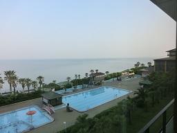 部屋に戻った子どもたちです。そして次の日の朝が来ました。窓の下にはプールが見えます。