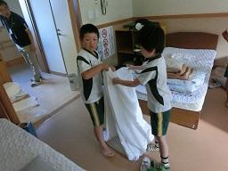 朝が来ました。シーツをたたむ姿が見られます。しかし途中で朝食の時間となりました。