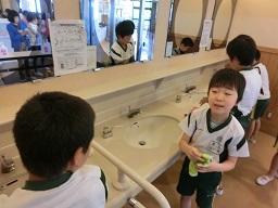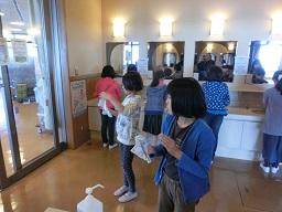 食堂の前の水道で手を洗います。石けんの泡も手動で出て来ます。