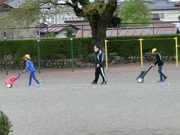 今朝の朝8時前の様子です。体育委員会の6年生が校庭にラインを引いています。