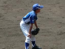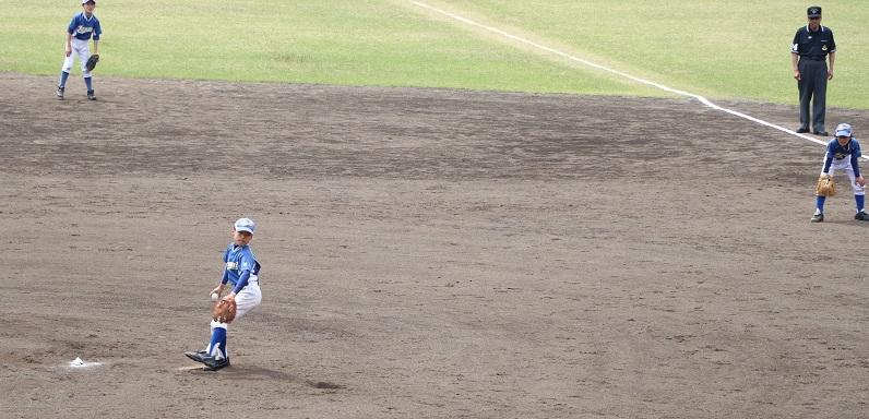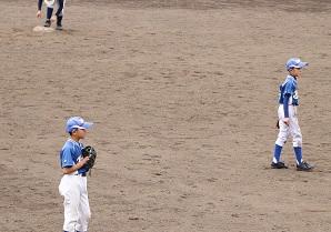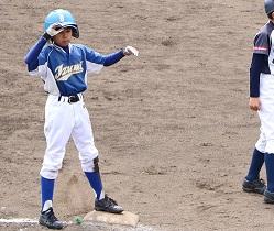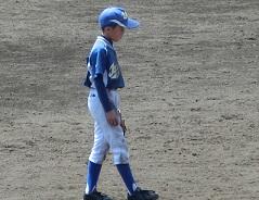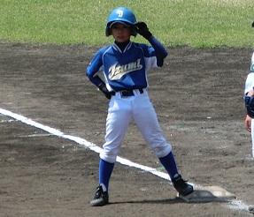さて、1塁に出ているのはMR君です。3回表にレフト前ヒットを打って塁に出た写真です。このヒットでKR君がホームを踏んで1点を返しました。
