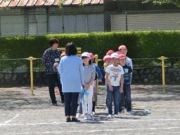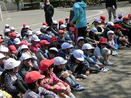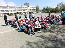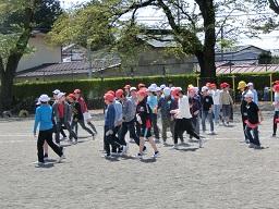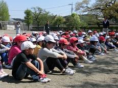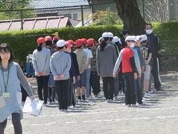 校庭に整列して係の先生が安全と人員を確認しています。