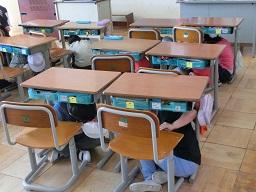 子供たちは最初地震なので、先生の指示で机の下にもぐりました。