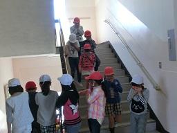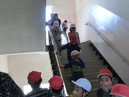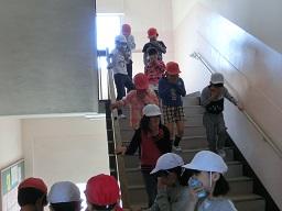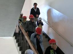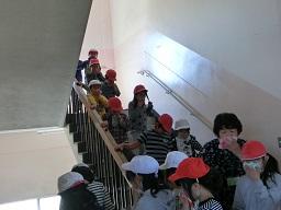 階段から4年生も下りてきました。2年生の後ろから廊下を非難してきたのは1年生です。