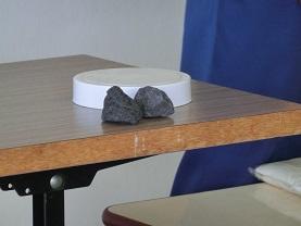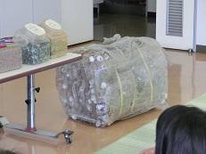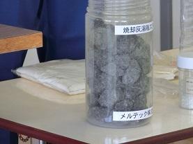 最初に、集められた資源ゴミがどうなるのかを教えてもらいました。上の右の写真は、焼却灰を固めたものだそうです。